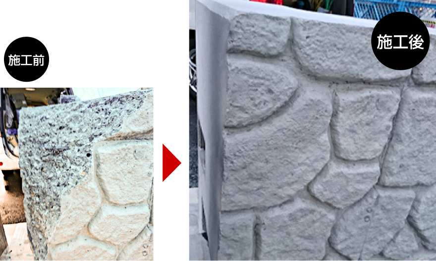モルタル造形で様々な素材に似せたものを作り出すことができます。既存の壁などの欠損部分を補い、エイジングを施すことで経年変化も違和感無く表現できます。